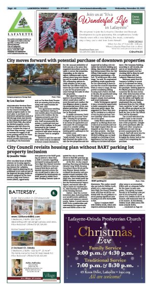 | Published November 23rd, 2022 | City moves forward with potential purchase of downtown properties | | By Lou Fancher |  | Campana property on Moraga Road Photo J. Wake | Administrative Services Director Tracy Robinson at the Nov. 14 city council meeting discussed progress made on the city's plan to purchase two downtown properties located at 990 Moraga Road, best known as the Campana property, and at 3533 Plaza Way, also called the McNeil property, which Robinson said will allow the city to "achieve the vision of the Plaza Way overlay," created to increase the supply of off-street parking within the Plaza Way block. The purchases would provide additional public parking to the businesses such as The New Park Theater that are entering that location, along with opportunities for other civic uses.