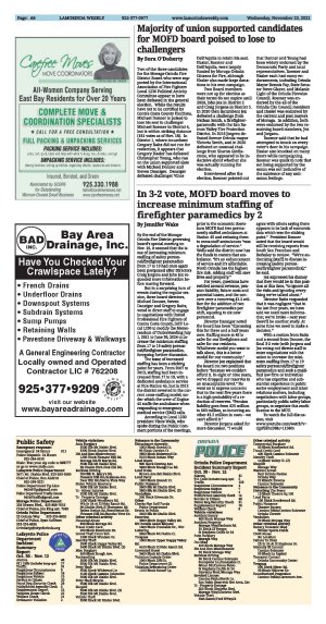 | Published November 23rd, 2022 | In 3-2 vote, MOFD board moves to increase minimum staffing of firefighter paramedics by 2 | | By Jennifer Wake | | | By the end of the Moraga-Orinda Fire District governing board's special meeting on Nov. 16, it seemed that the issue of increasing minimum staffing of safety personnel/firefighter paramedics from 17 to 19 had once again been postponed after Directors Craig Jorgens and John Jex requested more information before moving forward.