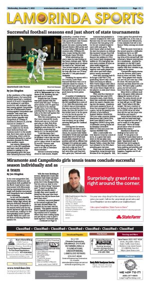 | Published December 7th, 2022 | Successful football seasons end just short of state tournaments | | By Jon Kingdon |  | Quarterback Luke Duncan Photo Scott Barmmer | At the conclusion of the regular football season, the Lamorinda football teams had a combined record of 25 and 5: Campolindo 10-0, Acalanes 9-1 and Miramonte 6-4, with Acalanes' only loss coming against Campolindo and two of Miramonte's losses coming against Campolindo and Acalanes. Each team was seeded second in the North Coast Section playoffs with Campolindo in Division II, Acalanes in Division IV, and Miramonte in Division V.