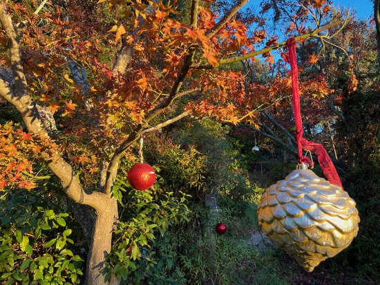 Christmas ornaments decorate Japanese maples. Photo Cynthia Brian