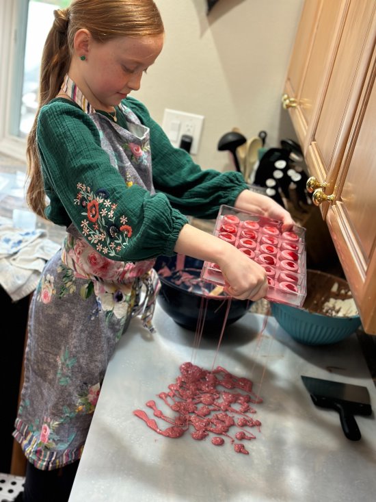 | Published February 1st, 2023 | Moraga 9-year-old launches charitable artisan chocolate business | | By Jenn Freedman |  | Kalyana Salvi creates a mold for her new Valentine's Day chocolates. Photo Jenn Freedman | It's not often that a preadolescent starts a business, much less a business rooted in philanthropy. But that is exactly what Kalyana Salvi has done, along with the help of her mom, Tenaya Garrett. In the fall of 2022, they launched Chocolates for Change, an artisan chocolate company that grants 20% of profits to a different nonprofit organization each quarter.