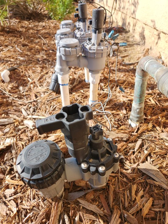 Next, locate your irrigation clock (or clocks) and learn how to operate it. Some clocks are in the garage. Some are outside on a wall near the valves. Run each valve (station) manually and note which sprayers or drippers are running. Make sure each valve shuts off completely. Just like hissing lawns, valves make noises. When you turn one on, it goes "whoosh" and sometimes you can hear the water running through the pipe. When you shut it off, it goes "slurp - clunk" as the valve diaphragm drops back into place. These sounds are good. Sometimes, if it is not shutting completely off, you'll hear a slight hissing or humming as water continues to run through the valve. Drip irrigation lines operate under pressure, so be patient and let the back pressure dissipate before you decide the drip line valve is not working.