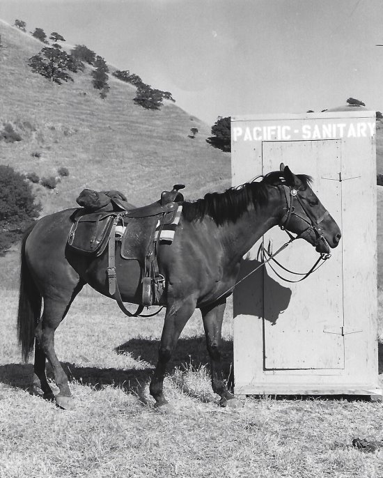 | | If only more of these outhouses had dotted the streets of Moraga in the 1970s and '80s. Photo courtesy Moraga Historical Society | | | | | | Seeing horses and cattle on the hills of Moraga is a common sight. There was a time when you didn't have to look up at the hills to see horses, because they were walking down the streets of town carrying their owners to the Moraga Shopping Center, the library (formerly on School Street), and other strategic locations around town where a hitching post was available for the rider's convenience. However, the more populous the town became the more some folks took umbrage at what the horses left behind.