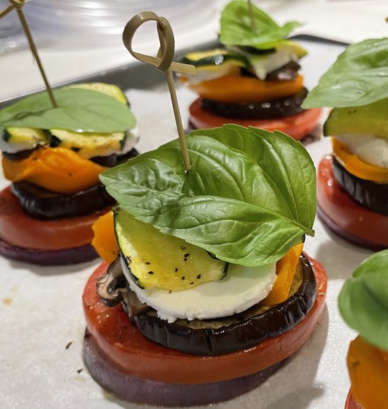Roast veggies until al dente, about 20 minutes. Remove from oven and cool. Once the veggies are cool enough to handle, line a baking sheet with a new piece of parchment paper and layer each stack on the parchment, beginning with eggplant on the bottom, then onions, tomatoes, mushrooms, bell pepper, goat cheese, and zucchini. Secure each in place with a toothpick through a basil leaf.
