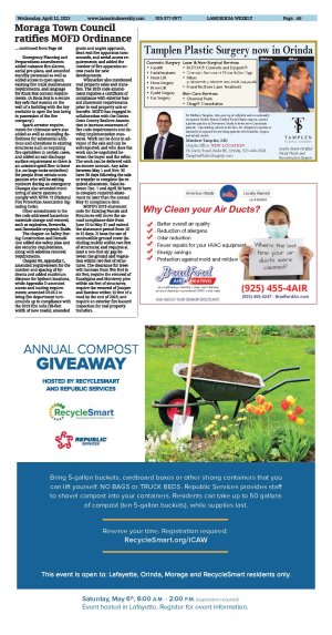 According to a March 22 staff report by Moraga Planning Director Afshan Hamid and Associate Planner Brian Horn, an MOFD report to its board of directors stated, "The proposed amendments are the product of a yearlong effort carried out by all of the Fire Marshals in Contra Costa County meeting as part of the Contra Costa County Fire Chiefs Association Fire Prevention Officers Committee. The Fire Marshal working group worked to create a consensus on amendments to adequately protect each community and create a standardized template for a county-wide fire code."