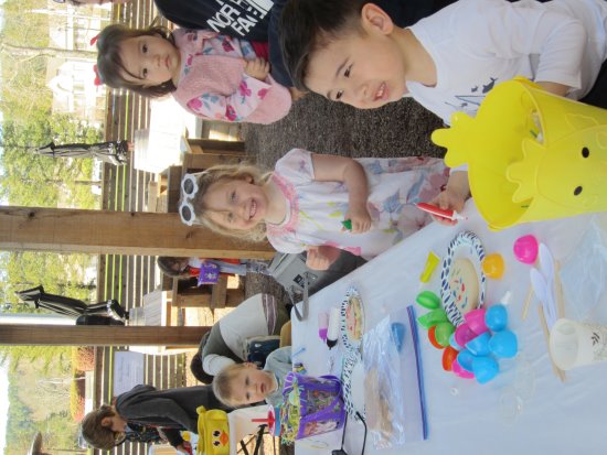 First came the Egg Hunt. Eleven families (approximately 50 people), with children ages 2 - 11, were given a basket and told to look for 200 plastic eggs filled with candy and small toys. The kids were very focused in their search for the strategically placed eggs hidden throughout the courtyard. Next time you visit CCB keep your eyes "peeled" for an egg or two that may have been left behind.