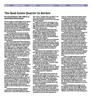 | Published April 26th, 2023 | The Real Estate Quarter in Review | | By Conrad Bassett, CRP, GMS-T; Licensed Real Estate Broker | | | The first quarter of 2023 began with a slower pace in activity on the residential side of Lamorinda real estate than previous years. Demand remains high but the supply has continued to be low. The closings that occurred, for the most part, came from properties that went under contract in late November to late February.