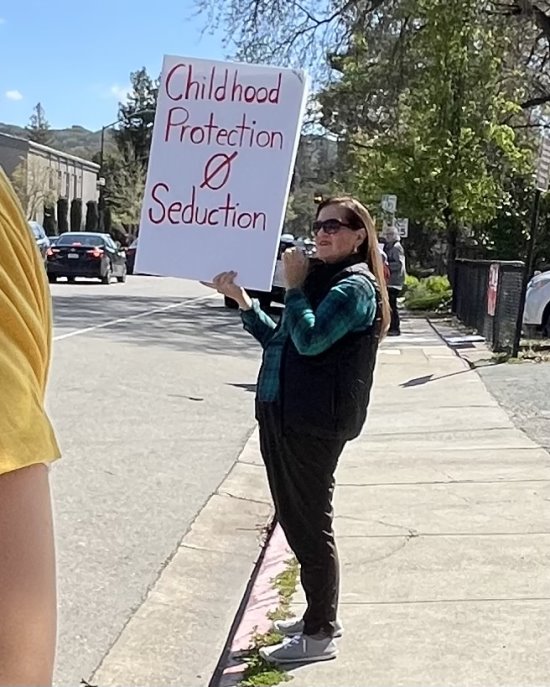 "(Biology is not bigotry) means there are two sexes - male and female. And to say that isn't to be a bigoted statement, it's a scientific statement," Disbrow said, while explaining her signs. "This sign says `sexual exposure is abusive.' That's based on a drag queen event that Burton Valley sponsored and the Lafayette School District endorsed."