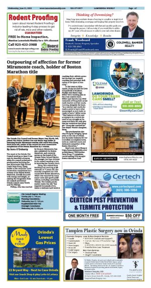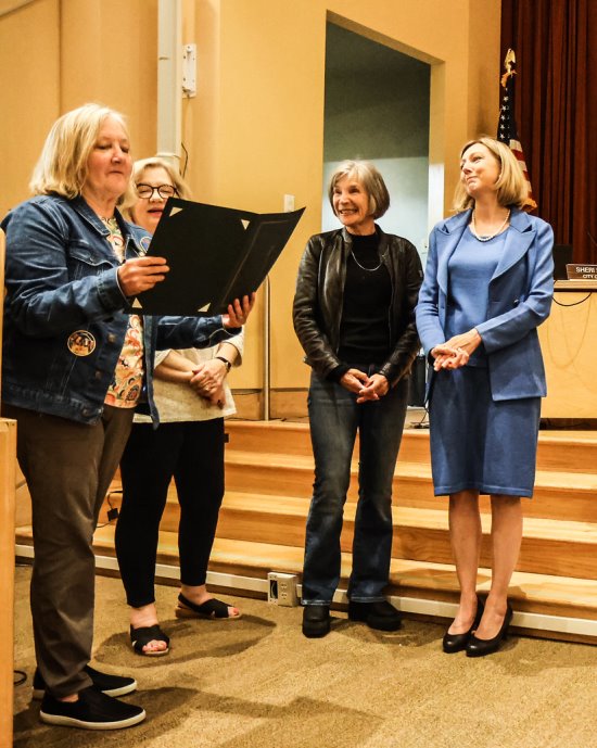 The mood at the Orinda City Council meeting on June 6 can only be described as joyous when the council presented a proclamation honoring former Miramonte High School Coach Patty Hung. Hung, holder of the record for most consecutive completions by a women of the famed Boston Marathon, literally bounced with energy and delight, accepting the recognition from the council and former Orinda mayors Amy Worth and Eve Phillips.