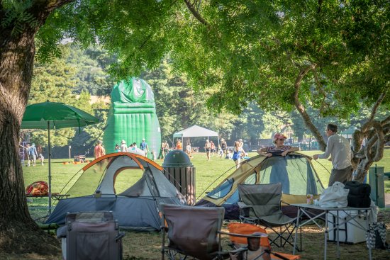 To the merriment of families, there was no lack of activities to keep the campers entertained: arts and crafts tables, lawn games, and exceptionally popular rocket building and launching. The kid-made "rockets," colorful cardboard tubes with safe foam tips, hurtled through the air as children and parents alike scrambled to retrieve their precious payloads. A particularly well-launched projectile made a surprising splash landing in one of the blue kiddie pools set up on the park's main lawn, delighting kids throwing water sponges nearby.