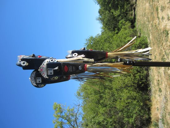 Brodwin's second piece is located not too far and across the path from "LOL." Tiara-wearing parking meters sporting red lips and earrings are called "Meter Maidens." The work comprises four parking meters placed on "pipe," weighing 100 pounds., standing 10 feet high by 3 feet wide. A friend of Brodwin's had asked him if he could make something out of decommissioned parking meters that came into her possession. "I said drop them by and I'd give it some thought. They looked like faces to me and as a group seemed to accent each other. Thus, using some pipe to support them, I created the grouping that became `Meter Maidens.'"
