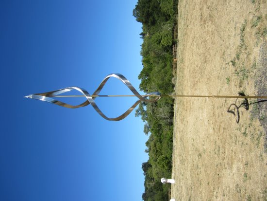 "Double Helix" is made of stainless steel, with 4-inch-wide strips spiraled around _-inch Electrical Metallic Tubing (EMT) pipe. Weighing 30 pounds, it stands 10 feet high by 3 feet wide. "'Double Helix' was inspired by research on Pinterest, where I saw similar ideas and expanded on those for this kinetic piece made of stainless steel ribbons and a central pipe with bearings to allow movement," explained Brodwin. "Having studied biology in college, I loved how this really had the look of DNA, especially in motion. So, as you can see, the inspiration for my sculptures is serendipitous and impulsive, and I love it!"