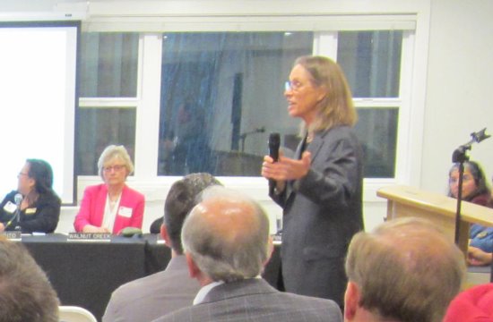 | | Housing Finance Authority Director Kate Hartley (standing, far right) holds the attention of Contra Costa Mayors Conference attendees. Photo Vera Kochan | | | | | | Established in 1951, for the purpose of being an educational forum for the county's elected officials, the Contra Costa Mayors Conference this month was hosted by the town of Moraga on the grounds of the Hacienda de las Flores in Moraga. Held on a monthly basis, the conference location rotates between the 19 municipalities within the county.