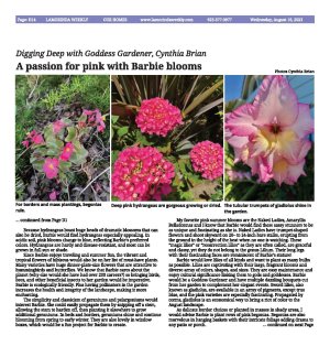 | | Published August 16th, 2023 | Digging Deep with Goddess Gardener, Cynthia Brian | | A passion for pink with Barbie blooms | | By Cynthia Brian |  | | Pink geraniums are simple, yet classic, just like Barbie. Photos Cynthia Brian | "My parents told me I'd point to a bed of flowers and say `Pink. Pretty' before I could say any other words!" ~ Joni Mitchell