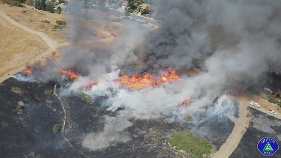MOFD hosted a Wildland Fire Training Burn that involved 15 additional fire districts. Contra Costa County Fire, Alameda County Fire, Oakland Fire, Hayward Fire, East Bay Regional Park District, San Mateo County, Cal Fire, Central Santa Cruz Fire District, Santa Clara County Fire, Watsonville Fire, Scotts Valley Fire, Ben Lomond Fire, Livermore-Pleasanton Fire, Rodeo Hercules Fire and CAL OES were on hand to take advantage of the training session, which this year covered 150 acres of the John Muir Land Trust's Painted Rock and the Moraga Geologic Hazard Abatement District (GAHD). Also on hand were members of the Lafayette Police Department, Chief Ben Alldritt, Administrative Analyst Cathy Surges-Moscato and Police Services Assistant John Cornell, who provided drone coverage from the top of Moraga's La Salle Drive, and Moraga Police Chief Jon King. Total involvement included 130 personnel, 29 fire engines, one dozer, and three wildland fire hand crews. Ambulances were also in attendance as a precaution.