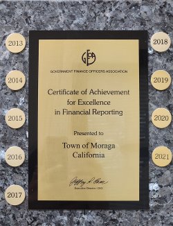 | Published August 16th, 2023 | Moraga awarded, yet another, financial reporting honor | | By Vera Kochan |  | The empty space on the Certificate of Achievement for Excellence in Financial Reporting will soon be filled by a tenth award medallion Photo Annie To | For the 10th consecutive year, Moraga has received the Certificate of Achievement for Excellence in Financial Reporting, going back to 2013. The commemoration comes in the form of a medallion which will join its nine predecessors on a plaque that hangs in the Town Offices.