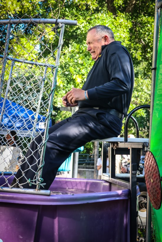 However, according to Officer Norma Perez, by far the most popular activity was dunking the Chief. For each donation of a backpack or school supplies, donors got three chances to dunk Chief of Police Ryan Sullivan in the dunk tank.
