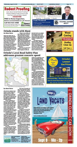 Before the regular Aug. 15 Orinda City Council meeting got underway, Mayor Inga Miller asked everyone attending the meeting, whether present in the Orinda Library Auditorium or at home in front of their computer screens, to spare a thought for the suffering of the people of Maui. At that point over a hundred people were known to have died, while more than one thousand still remained unaccounted for.