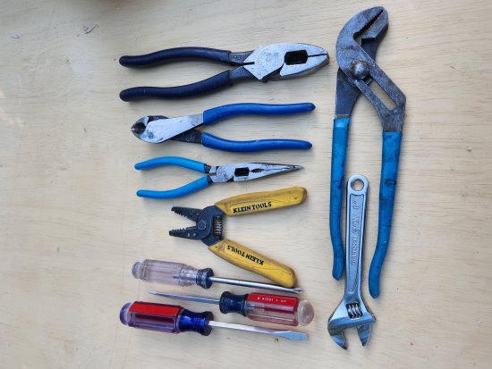 Pliers. There are a huge variety of pliers. To start, definitely get a pair of needle nose pliers, get an adjustable wrench, and a pair of lineman pliers. If you want to be better prepared, add a pair of diagonal pliers for cutting wire. The adjustable wrenches (formerly known as Water Pump Pliers), come in different lengths; get a 12-inch pair, and if you sense bigger trouble ahead, get a bigger size for backup. Most needle nose pliers come with a wire cutter built-in, but that is not always convenient for nipping wires. It's useful to have wire cutters and you may also want a pair of wire strippers as well. These, combined with a good set of screwdrivers, will get you through most household issues.