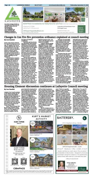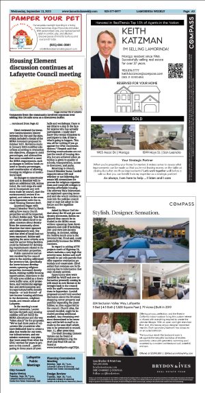 Senior Planner Renata Robles, Housing Consultant Diana Elrod, and Planning and Building Director Greg Wolff presented an analysis of the impacts of growth stemming from the housing plan and housing opportunity sites identified to accommodate the mandated Regional Housing Needs Allocation of 2,114 assigned to Lafayette. An additional required buffer pushes the totals to approximately 3,000 new housing units between 2023-31.?Notably, the Housing Element is required by state law to contain programs to Affirmatively Further Fair Housing.