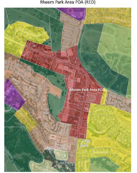 | | Rheem Park Area red Image courtesy Moraga Planning Dept | | | | | | With the town recently adopting the Sixth Cycle Housing Element for 2023-31, staff hopes to submit an application to the Metropolitan Transportation Commission (MTC) with the idea that the Rheem Park Area will receive a designation as a Connected Community Priority Development Area (PDA).