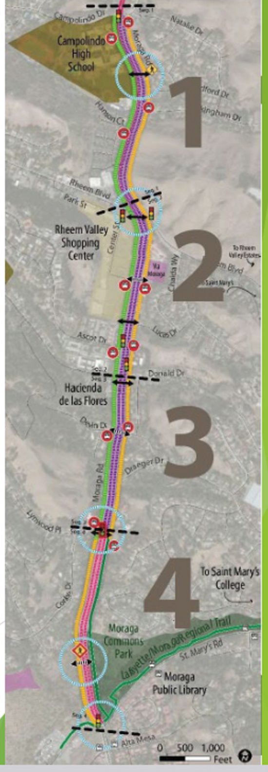 The four segments included are: Segment 1 - Campolindo Drive to Rheem Boulevard; Segment 2 - Rheem Boulevard to Donald Drive; Segment 3 - Donald Drive to Corliss Drive; and Segment 4 - Corliss Drive to St. Mary's Road.