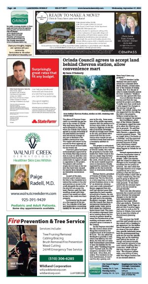 | Published September 27th, 2023 | Orinda Council agrees to accept land behind Chevron station, allow convenience mart | | By Sora O'Doherty |  | Area behind Chevron Station, station on left, retaining wall center back Photo Sora O'Doherty | The plans of Chevron Corporation to remodel the gas station at the corner of Orinda Way and Santa Maria Way were advanced on Sept. 19, when the Orinda City Council agreed to accept ownership of the land behind the station and introduced changes to city law to facilitate a ExtraMile convenience store. The matter will return to the council for final approval after some issues around liability are ironed out.