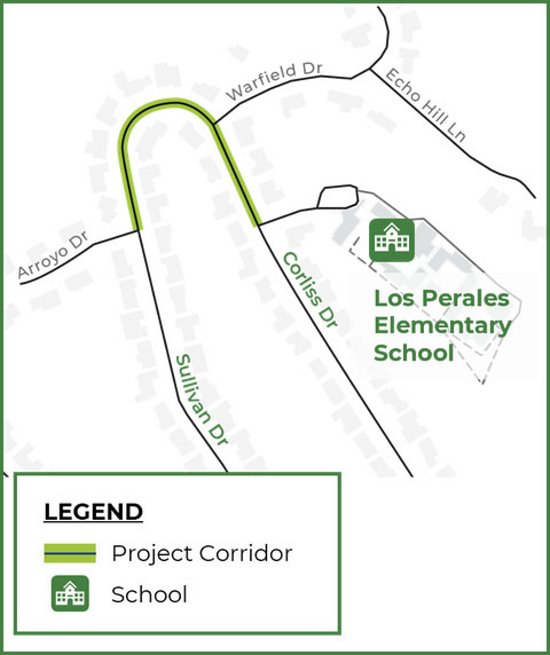The main goal of the project is to improve access and safety in order that pedestrians, bicyclists, and Los Perales Elementary School students feel safer along the upper Corliss Drive/Sullivan Drive corridor (along the curve).