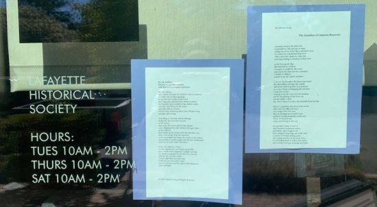 In the window of the Lafayette Historical Society at the back of the Lafayette Library, a blue mat surrounds a two-page poem entitled, "The Guardian of Lafayette Reservoir." It is written by local poet Ophelia Leong and focuses on the Reservoir tower.
