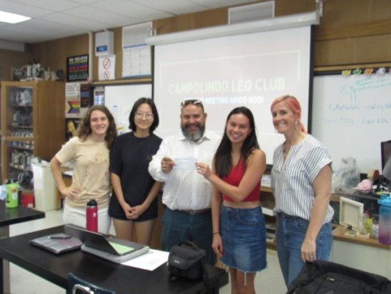 The Leo Club of Campolindo High School, which has participated in fundraising activities with the Moraga Lions Club, including Fourth of July festivities, the Pear Festival, and Community Service Day, presented a $1,000 check for the Moraga Education Foundation to Campolindo Principal Pete Alvarez at its October meeting. The Leo Club presently has 38 members and plans to continue to provide community service throughout the school year to help the visually impaired, homeless, environment, and others in need. This is the 19th year the club has donated to the Moraga Education Foundation.