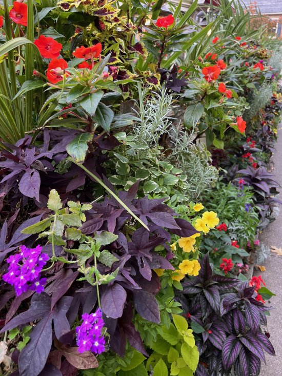 The vibrant colors of autumn are not only experienced in the changing of the leaves, but also in containers and beds planted with mums, dahlias, cannas, marigolds, petunias, roses, phlox, calibrachoas, salvias, sages, verbenas, impatiens, and coleus. It's easy to design a beautiful combination by tucking several different species into a container filled with potting soil, allowing calibrachoas, verbenas, and petunias to spill over the sides.