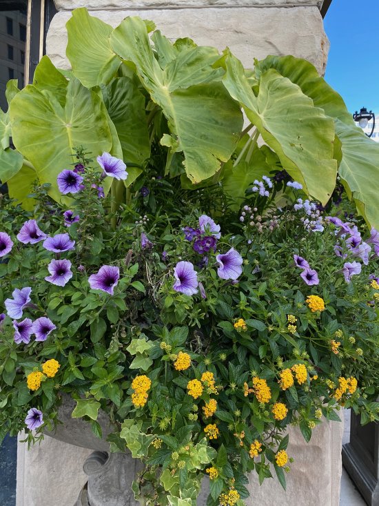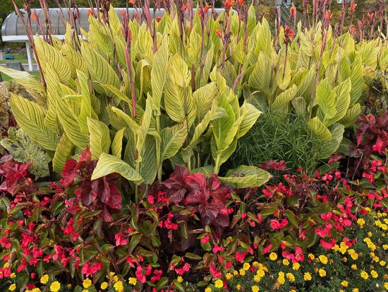 | A colorful combination of canna lilies, impatiens, and marigolds. |