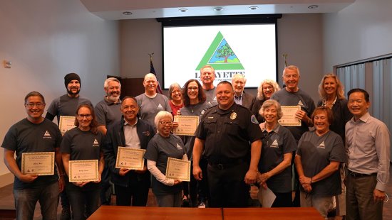 | | The ceremony finished with a group photo of graduates taken with Lafayette City Council members, Crime Prevention Commissioner Judy Peterson, and Lafayette Police Chief Ben Alldritt. Photo courtesy City of Lafayette | | | | | | Lafayette Police Chief Ben Alldritt introduced Lafayette's Citizens' Police Academy graduates - 11 from Fall 2022, and 12 from Spring 2023 - at the Oct. 23 city council meeting. The fall graduating class was the first class back since COVID-19 put the program on hiatus.