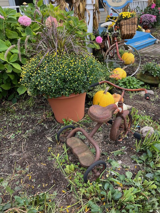 What else has me charmed this November? Chrysanthemums, blue plumbago, and crimson fountain grass are attractive plants that add color and interest to autumn gardens. The tips of pencil cactus have turned a brilliant orange, matching the pumpkins I've seen decorating porches. My gigantic green guavas self-harvested. I gathered them and will let them ripen on the counter before either eating them raw or making jam or juice. While visiting a small town, I happened upon a front yard that featured a rusty tricycle, alongside pumpkins, hydrangeas, and a vintage bicycle with a basket filled with yellow mums. The gardenscape could have been tidier, yet it was an interesting combination of elements that piqued my imagination and brought a big smile to my face.