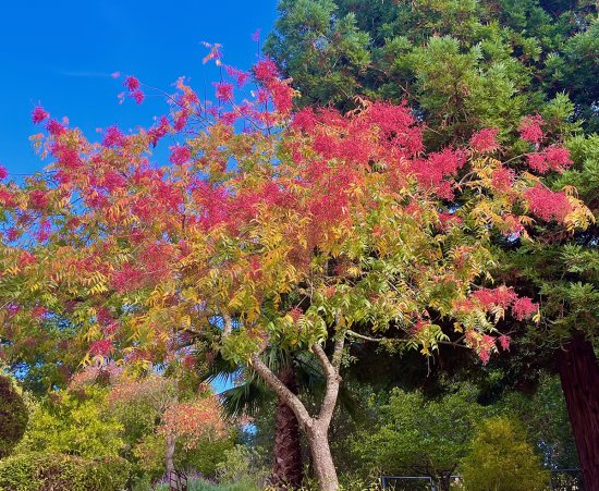 Just in time to celebrate Thanksgiving, my trees and shrubs have finally donned their fiery fall finery. The show is spectacular as my numerous trees burst into colors of amber, gold, orange, crimson, purple, sienna, and red. Leaves on my grapevines and fruit trees of apple, prune, peach, apricot, cherry, mulberry, persimmon, fig, pomegranate, pear, and plum all boast a cornucopia of glorious hues that complement the shades of other deciduous trees including maple, pistache, sumac, tupelo, liquidambar, and crape myrtle. How grateful I am to witness this spectacular seasonal wardrobe change. Two of the most fascinating trees to me are my Chinese pistache. The male tree is tall, robust, sturdy, and golden. The female pistache is petite, graceful, and filled with clusters of crimson fruit that provide tasty treats for the birds and squirrels. If any berries remain in December, their colors will morph to aqua and pink, and I will pluck them to tuck into the branches of a holiday tree. I have allowed some seeds from my Chinese pistache tree to sprout in specified areas where I prune the plants to keep them small. As the weather cools, these volunteers resemble colorful blossoms.