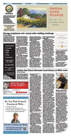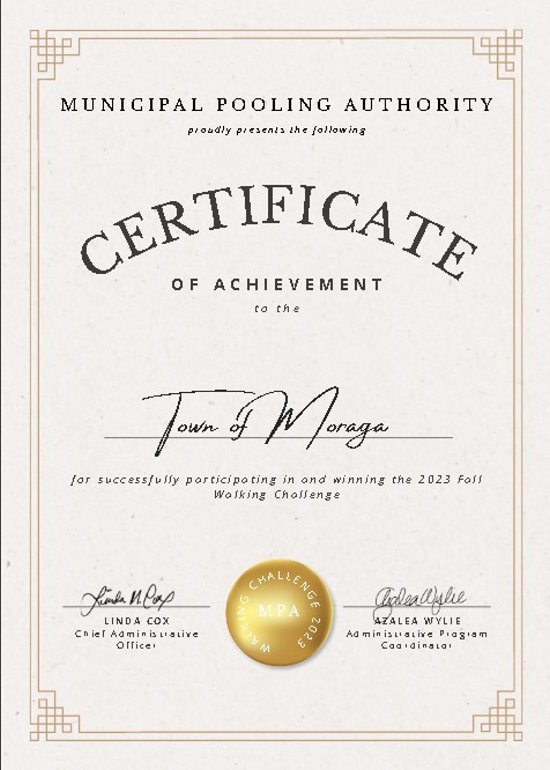 | Published November 22nd, 2023 | Moraga employees win county-wide walking challenge | | By Vera Kochan |  | Certificate awarded to the town for winning Fall Walking Challenge 2023 Photo courtesy Municipal Pooling Authority | The Municipal Pooling Authority, which provides workers' compensation insurance and liability coverage to municipal employees, held its first ever Fall Walking Challenge 2023, which spanned the month of October and was officially over on Oct. 31.? Of the 14 Contra Costa teams that participated, 10 employees from the small but mighty town of Moraga came in first place with 322,334 average steps per day. Orinda came in second with 294,958 and Lafayette placed fifth with 246,865.