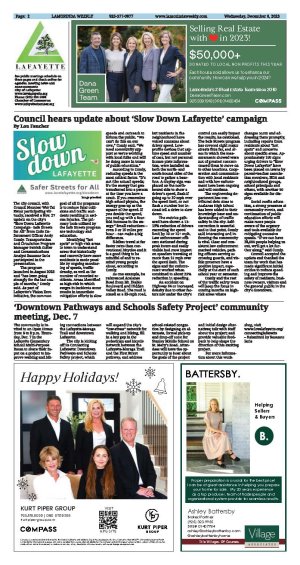 | Published December 6th, 2023 | Council hears update about 'Slow Down Lafayette' campaign | | By Lou Fancher |  | Image provided | The city council, with Council Member Wei-Tai Kwok participating virtually, received a Nov. 27 update on the city's "Slow Down Lafayette Campaign- Safe Streets for All" from Code Enforcement Officer Andy Comly. Transportation and Circulation Program Manager Patrick Golier and Communications Analyst Suzanne Iarla participated in the presentation.