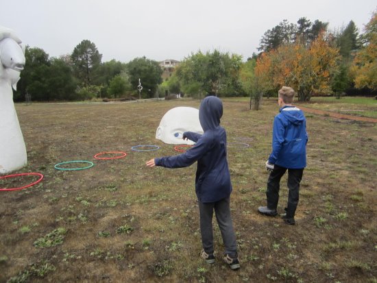 Artist Buddy Brodwin participated and watched as everyone tossed the mud balls into strategically placed Hula Hoops that were in the vicinity of his three works: "Double Helix," "LOL," and "Meter Maidens." Artist Tony Zorich's "The Fisherman" had the most Hula Hoop targets in that his piece takes up more space. Prizes were given out to the kids who had the most meat ball-sized clods thrown into a hoop.