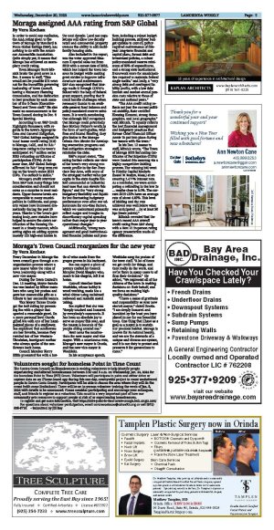 | Published December 20th, 2023 | Moraga assigned AAA rating from S&P Global | | By Vera Kochan | | | In order to avoid any confusion, the AAA rating given to the town of Moraga by Standard & Poors Global Ratings (S&P), has nothing to do with the American Automobile Association. Quite simply put, it means that Moraga has achieved an exemplary credit rating.