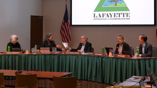 | Published December 20th, 2023 | New Lafayette mayor and vice mayor take the reins | | By Lou Fancher |  | Outgoing Mayor Carl Anduri is presented with a pen from new Mayor Gina Dawson at the Dec. 11 Lafayette City Council meeting. Photos courtesy Suzanne Iarla, City of Lafayette | Outgoing Lafayette mayor Carl Anduri's opening words at the Dec. 11 council meeting began with heavy levity, noting that it was the first opportunity in four years to hold the council transition meeting announcing the new mayor and vice mayor in person, due to the pandemic interruption and virtual ceremonies during intervening years. "So yes," said Anduri, in an obvious reference to the tragic events on January 6, 2021, following the 2020 presidential election, "this is the first peaceful transfer of power since 2019."