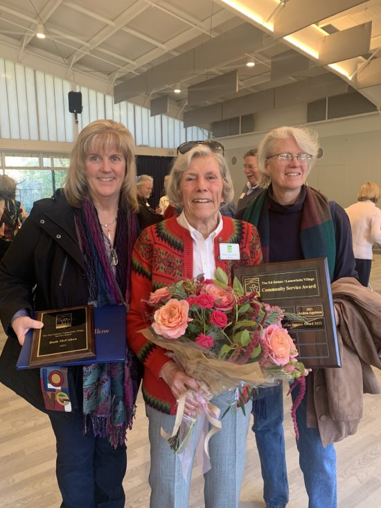 | | Don Jenkins Community Service Award recipient Ruth McCahan (center) Photo provided | | | | | | Lamorinda Village, a Lafayette, community-based organization dedicated to supporting older adults and fostering a strong sense of connection, hosted its 9th annual Afternoon of Gratitude event on Dec. 8, in celebration of its members, dedicated volunteers, and outstanding community supporters. The event, held at the Jennifer Russell Building in the Lafayette Community Center, brought together more than 150 attendees, including the distinguished presence of six incoming, current, and former mayors representing all three towns. Attendees enjoyed wine and appetizers from Town Bakery and were treated to a captivating performance by the Stay at Tone Moms.