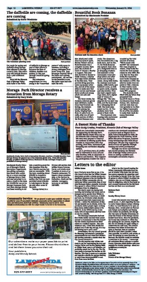 I read with interest your front-page article on Jan. 17, 2024 regarding the Contra Costa County Library system refusing to allow our local libraries to be open on Sundays. First, I would point out that not only Orinda and Lafayette had Sunday hours before the pandemic, but Moraga also was open on Sunday afternoons, because the Friends of the Moraga Library funded those hours. Since the pandemic, the County has continued to refuse Sunday openings for our patrons, despite the fact that the Friends are again willing to underwrite the staff costs. The County's insistence that unless all branches are open on Sundays, then no branches should be open seems punitive, rather than equitable. As noted in your article, at least "by opening up some branches on Sundays, the libraries would be available to everyone in the county." I encourage all Lamorinda library patrons to contact County Librarian Alison McKee with your requests for Sunday openings: alison.mckee@library.cccounty.us