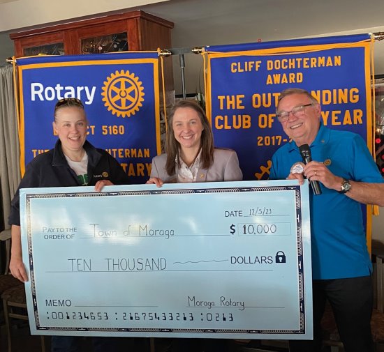 Mackenzie Brady, Director of Moraga's Park & Recreation Department, was giving a presentation about town activities at a recent meeting of Moraga Rotary Club, and was surprised to receive a check to the town for $10,000 for use at the Moraga Commons Park. Last year, Moraga Rotary had been working to obtain a matching grant for this donation from Rotary District sources, but was not successful. With the town receiving about $28,000 in donations from Moraga Rotary earlier, the Club has now provided about $38,000 to help improve the picnic and other areas of the park.