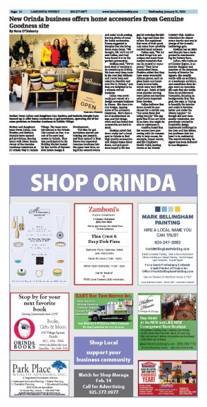 | Published January 31st, 2024 | New Orinda business offers home accessories from Genuine Goodness site | | By Sora O'Doherty |  | Mother Gwen Callan and daughters Lisa Hoskins and Stefanie Murphy have teamed up to offer home accessories at gcd provisions, operating out of the same premises as Genuine Goodness in Orinda Village. Photo Sora O'Doherty | Mother and daughters team Gwen Callan, Lisa Hoskins and Stefanie Murphy have opened gcd provisions, sharing space with Diane Eames, owner of the Genuine Goodness restaurant at 21 Orinda Way in Orinda Village. The team were introduced to the Orinda City Council on Dec. 5 as one of the new businesses in Orinda. They also participated in the Holiday Market hosted by Ben Zarrin of Paymun Real Estate Design & Development.