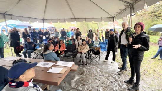 City Parks Director Jonathan Katayanagi welcomed the large crowd into a 600-square-foot tent, and more neighbors gathered outside under umbrellas. Scientific Art Studio (SAS), the design team for these two projects, began the workshop with Creative Director Ron Holthuysen.