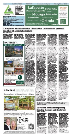 | Published February 28th, 2024 | Lafayette's Transportation Circulation Commission presents long list of accomplishments | | By Lou Fancher | | | Presenting to city council the Transportation Circulation Commission's highlighted 2023 accomplishments and 2024 work plan, committee chair Bart Carr on Feb. 12 said, "Probably our biggest accomplishment in the year was the Local Road Safety Plan, which is really the centerpiece action supporting our Vision Zero approach to traffic safety."