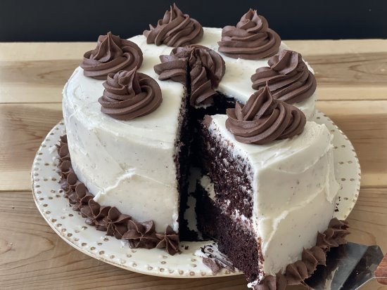The reason we love this chocolate and vanilla version is because one of our very favorite cakes comes from Amy's Bread, a fabulous bakery in New York City. For our daughter's 30th birthday party several years ago, we ordered four cakes from Amy's Breads, and while all were fantastic, their Black and White was our absolute favorite. It was a dark chocolate cake with white vanilla buttercream. Sooooo good! Ever since that time, whenever I visited Courtney while she was living in New York, we made it a point to pick up a couple of slices of this luscious cake. She no longer lives there, but we still needed our regular fix of this amazing cake, so we started making our own.