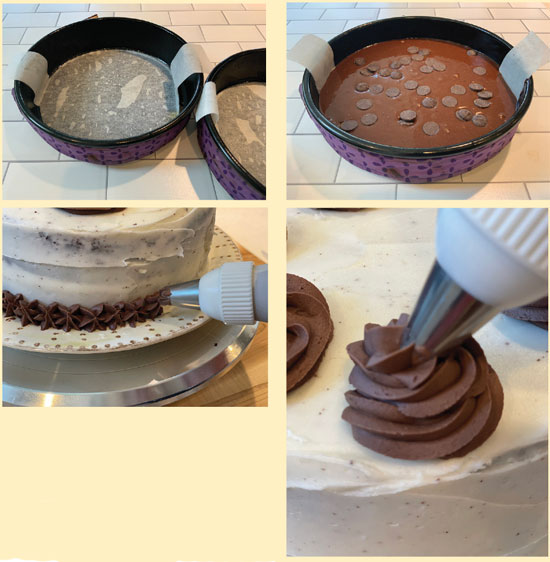 To make all the fun swirls of frosting on top of the cake, remove about 1 cup of the vanilla buttercream frosting and add 2-3 tablespoons of cocoa powder to it. Blend well, and add just a dash of milk, if the frosting is too thick. Then, using a pastry bag and a number 824 open star tip with the matching coupler, make the swirls on top of the cake and along the bottom edge. It looks so fancy this way! But, if you are more inclined, you can also just frost the top of the cake and in between the layers, to expose the cake layers. This is easy and makes a beautiful naked style cake.