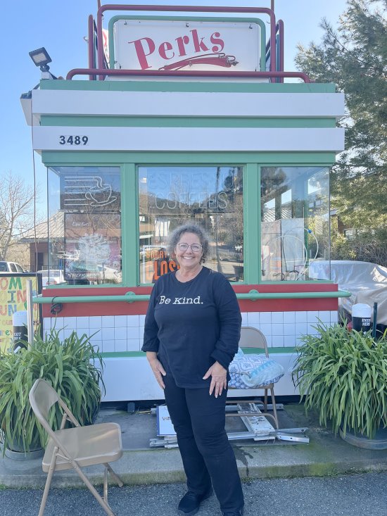 | Published March 13th, 2024 | The end of an era | | By Sharon K. Sobotta |  | Laura Kirleis Photo Sharon K. Sobotta | Laura Kirleis sat on a lawn chair in front of the tiny square Perks/Caffino where she's spent a quarter-century of her life - serving coffee, smoothies, hot breakfast sandwiches, snacks, warm greetings, smiles, and well wishes. "I'm sad," Kirleis said while smiling through tears "I'm going to miss it. The people we see everyday mean a lot. There's a lot of interaction. It's a very special place."