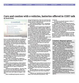 | Published March 27th, 2024 | Care and caution with e-vehicles, batteries offered in CERT talk | | By David Scholz |  | Image provided | Even as e-vehicles (EVs) and other e-mobility devices continue ruling the day for consumers for the convenience they provide, first responders are extolling a cautious position and safety first approach when it's time to park and charge them at the end of the day.